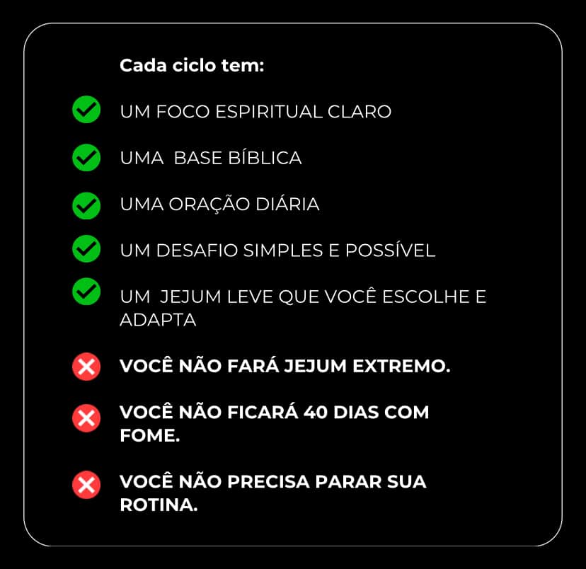 O desafio é dividido em 4 ciclos de 7 dias + 10 dias finais de libertação profunda.